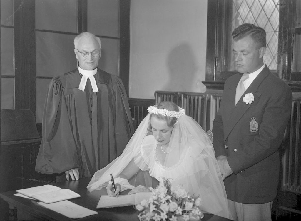 Une mariée, Sheila Brown, signe l'acte de mariage dans le registre de l'état civil. Nous remarquons son époux et un ministre du culte