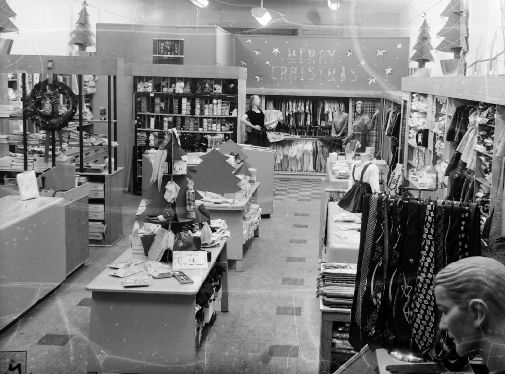 Nous voyons l'intérieur du magasin de tissus et de vêtements J. B. Templeman de l'avenue Westminster à Montréal-Ouest