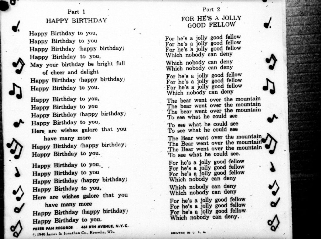 Nous voyons les paroles des chansons «Happy Birthday» et «For He's a Jolly Good Fellow»