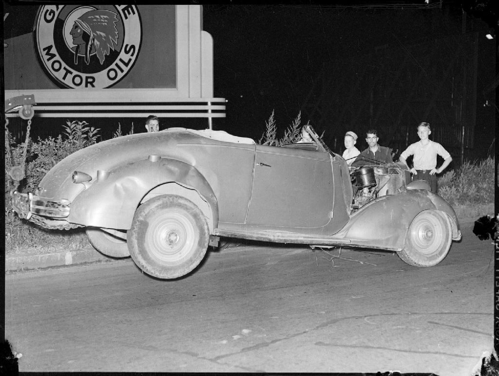 Sur la route de Lachine, nous voyons une automobile accidentée accrochée à une remorqueuse. Près de l'automobile, nous remarquons un panneau publicitaire «Motor Oils»