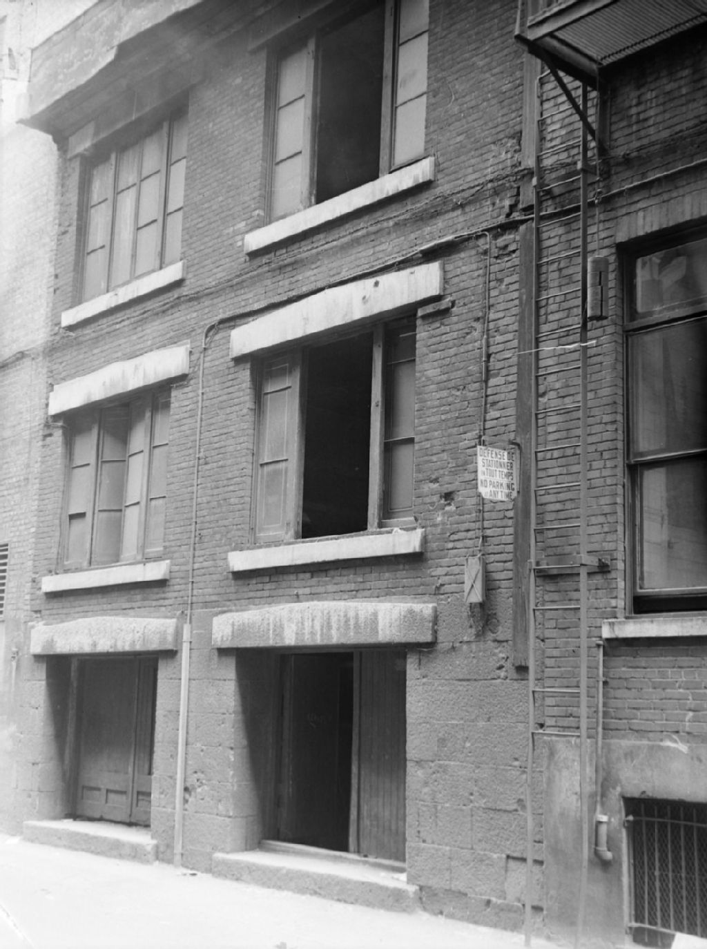 Nous voyons l'extérieur d'un immeuble en briques dans lequel les entrepreneurs de construction Purdy & Henderson effectuent des travaux de rénovations