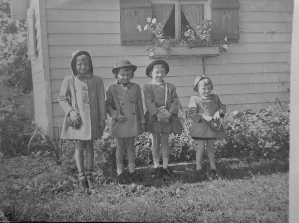 Nous voyons quatre petites filles, en manteau et coiffées d'un chapeau, dans le jardin d'une maison