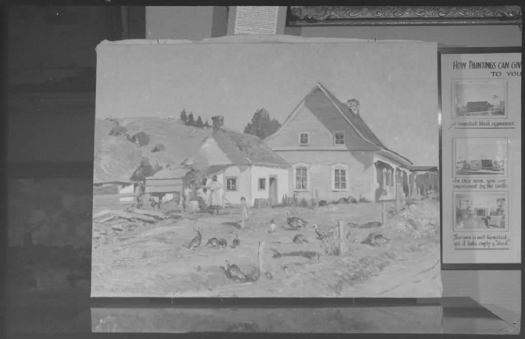 Nous voyons une toile photographiée à la galerie d'art Watson, située au 1434 Sherbrooke Ouest à Montréal. Nous remarquons la maison de style canadien, un enfant regardant des canards et des poules. Nous apercevons une femme enfournant son pain dans un four extérieur
