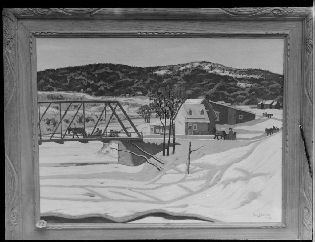 Nous voyons un tableau de l'artiste Jean Langlois, représentant une scène d'hiver à la campagne. Nous remarquons la montagne, la maison canadienne, les carrioles tirées par des chevaux et un pont. Cette oeuvre est exposée à la galerie «Art Association» située au 1379 Sherbrooke Ouest à Montréal