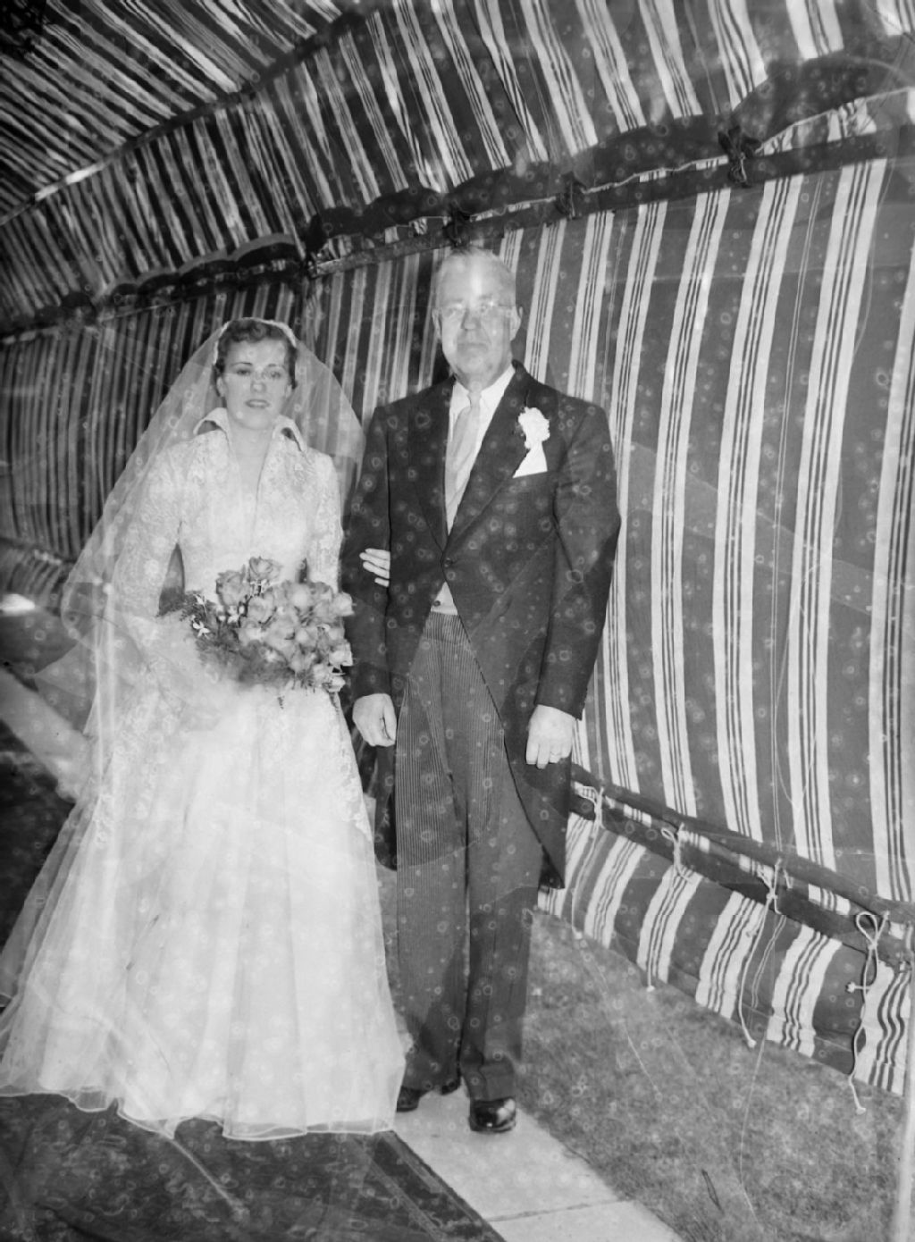 La nouvelle mariée, Madame Dalziel-Griffin, et son père se tiennent sous la marquise tendue au-dessus de l'entrée de l'église où le mariage va être célébré