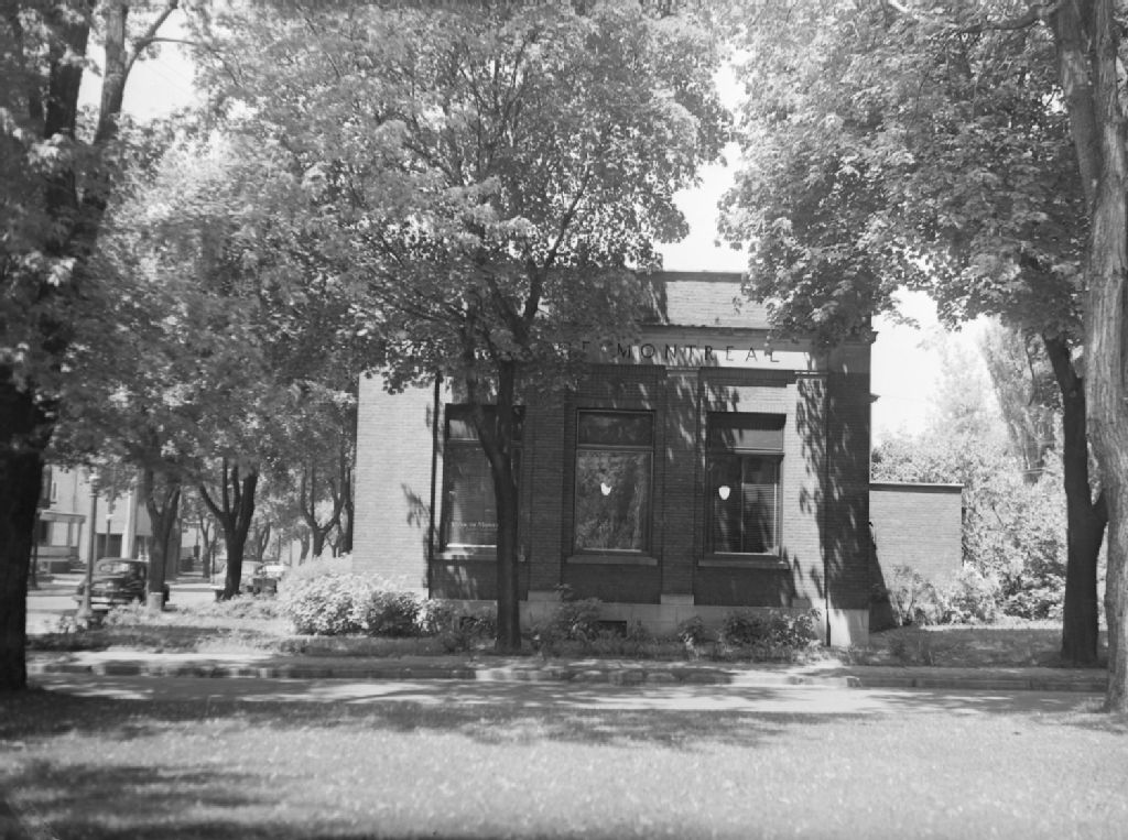 Nous voyons l'édifice de briques d'une succursale de la Banque de Montréal