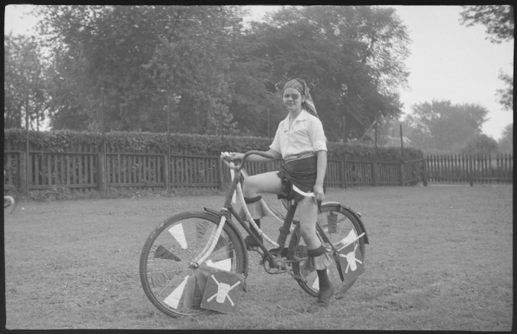 À Montréal-Ouest, nous voyons une fille assise sur sa bicyclette décorée de rubans et de papiers. Nous remarquons qu'elle personnifie un pirate avec son foulard noué sur la tête, son sabre et son pavillon représentant l'emblème de la tête de mort