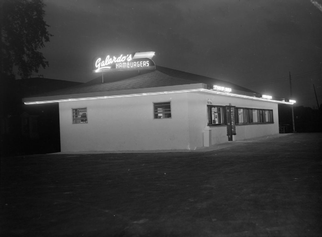 Nous voyons l'extérieur du casse-croûte Galardo's Hamburgers