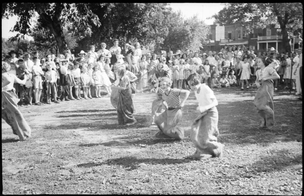 Children's Activities. Sack Race. Marcil Park, 20 août 1938, Archives nationales à Montréal, Fonds Conrad Poirier, (06M,P48,S1,P2136), Poirier, Conrad.