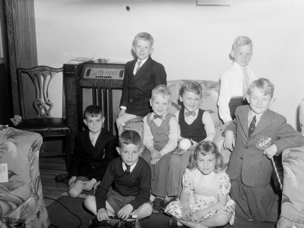 Un groupe de garçons et une petite fille sont réunis pour une fête organisée pour Leslie Arter. Deux garçons portent un veston de Dunrae Gardens School de ville Mont-Royal. Nous remarquons un gros meuble-radio dans la pièce