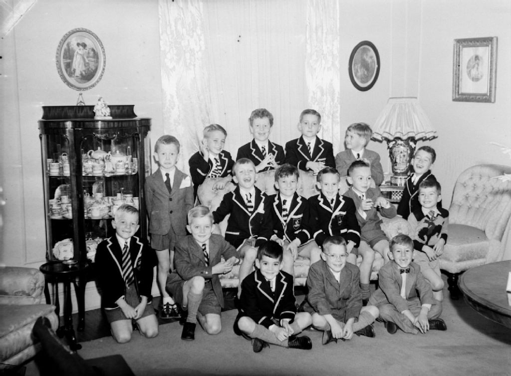 Des garçons, plusieurs en veston de Selwyn House School, sont réunis pour une fête organisée pour Lawrence Hibbert. Nous remarquons un vaisselier rempli de faïence