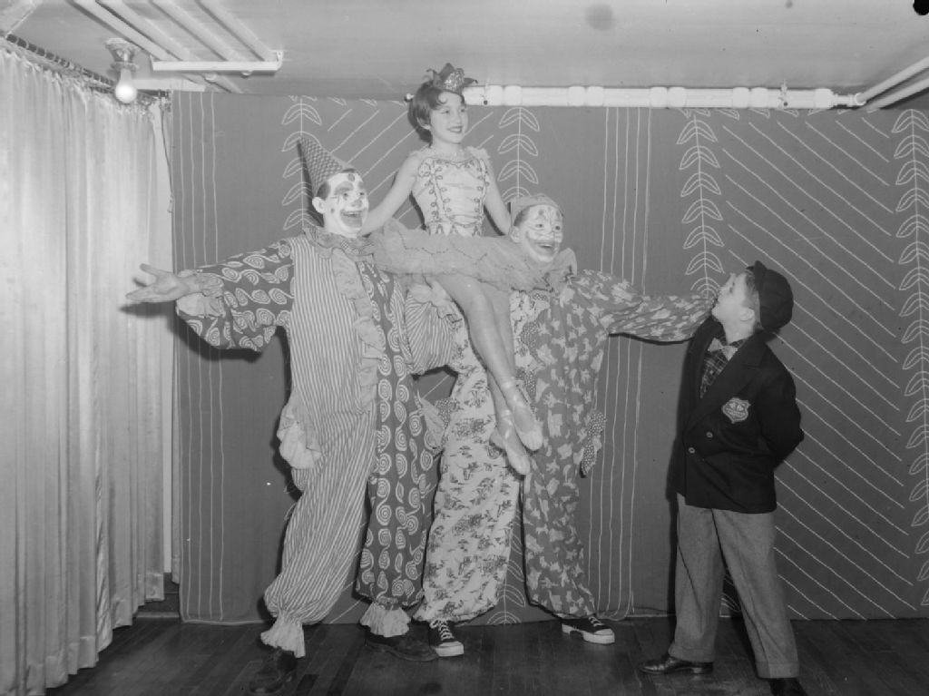 Nous voyons une scène de cirque avec des clowns, une ballerine et un garçon portant un veston avec l'écusson du «Montreal Children's Theatre», dans une pièce de théâtre pour enfants