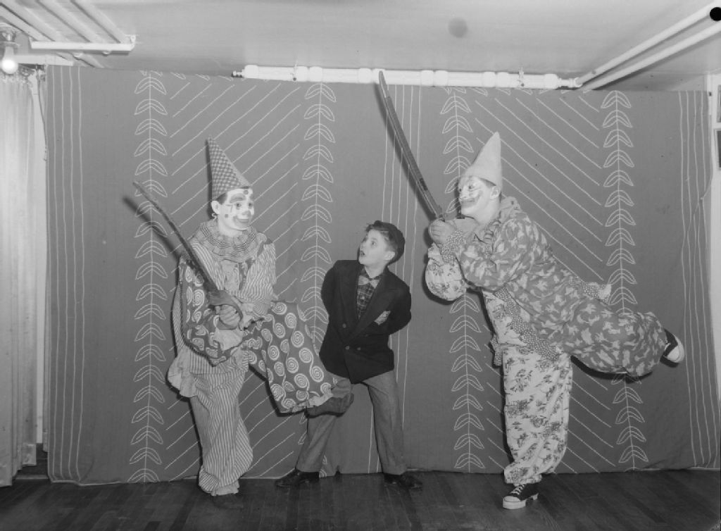 Nous voyons deux clowns et un garçon portant un veston avec l'écusson du «Montreal Children's Theatre», dans une scène de cirque d'une pièce de théâtre pour enfants