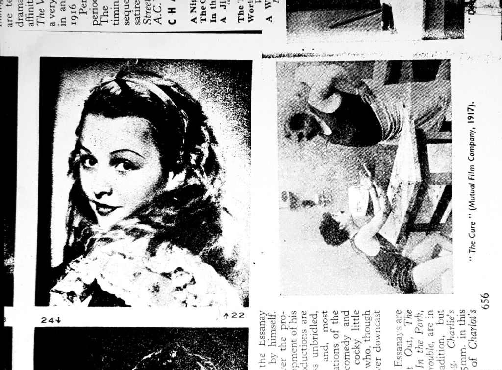 Nous voyons deux photographies publiées dans une revue : Charlie Chaplin dans le film «The Cure» et l'actrice Charlotte Henry