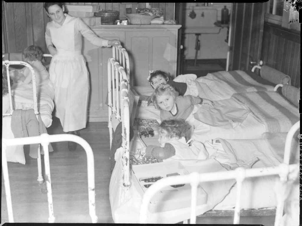 Nous voyons une infirmière du «Children Memorial Hospital» en uniforme, portant le tablier, debout au chevet de quatre fillettes alitées sur le ventre dans des lits de fer. Nous apercevons chacune jouant avec des cadeaux déposés devant elles