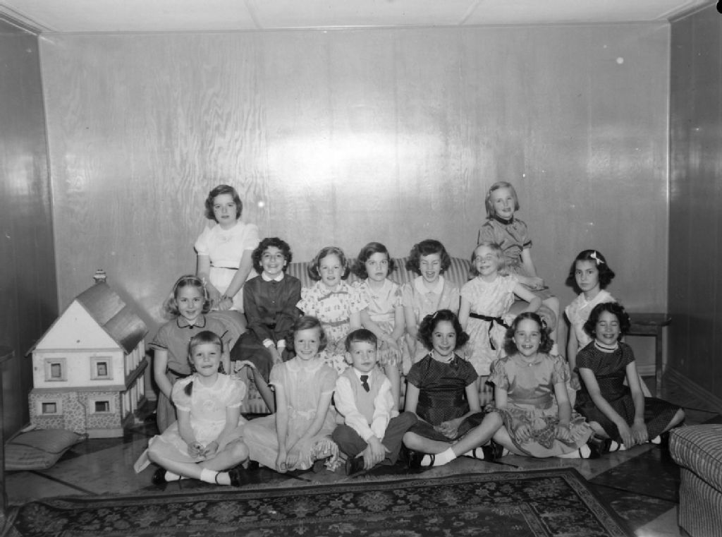 Un groupe de filles et un petit garçon sont réunis pour une fête organisée pour Alix Tryon qui habite avenue Devon à Mont-Royal. Nous remarquons une maison de poupée dans la pièce où ils se trouvent