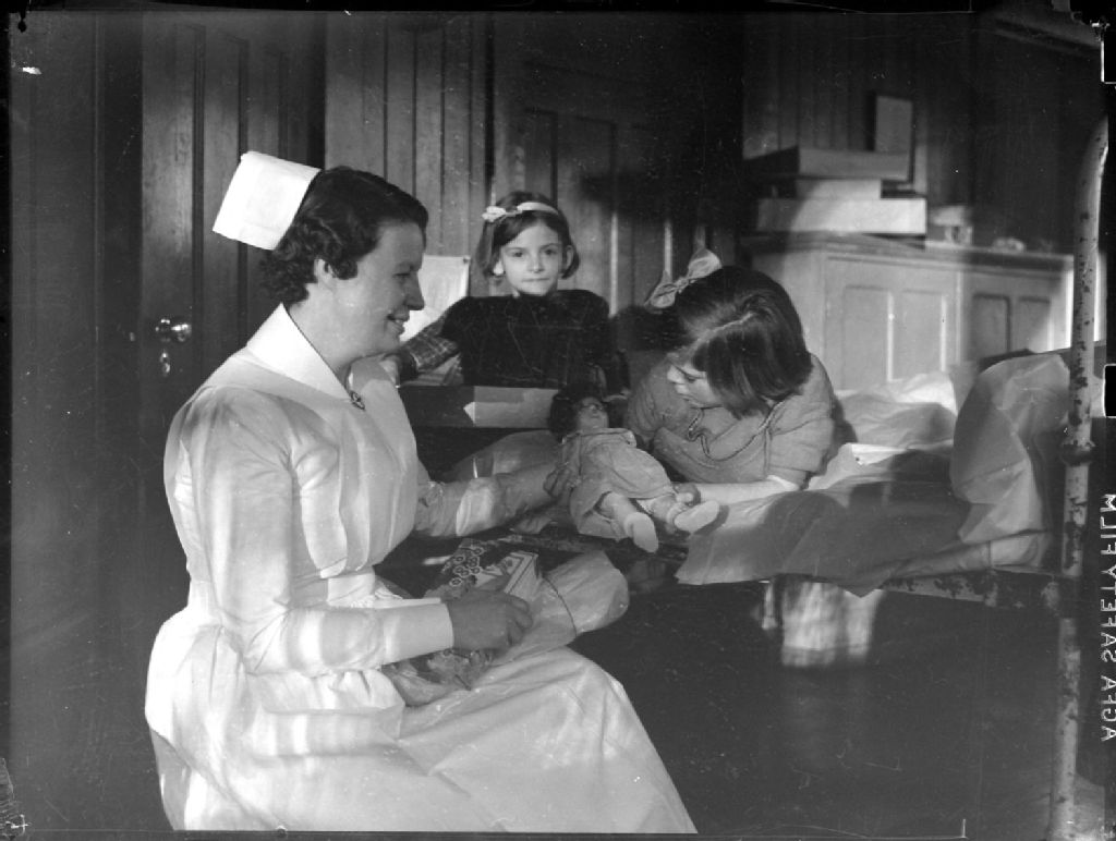 Nous voyons une infirmière du «Children Memorial Hospital» en uniforme, portant la coiffe, assise au chevet d'une fillette alitée qui tient une poupée vêtue d'une robe à pois. Une deuxième fillette tient un autre cadeau dans ses mains. L'infirmière tient un cadeau sur ses genoux