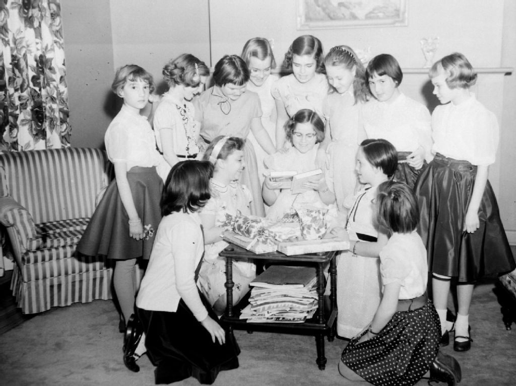Des filles entourent Jean Rankin qui ouvre les cadeaux, dont deux livres, qu'elle a reçus pour son anniversaire. Les Rankin habitent avenue Lockhart à Mont-Royal