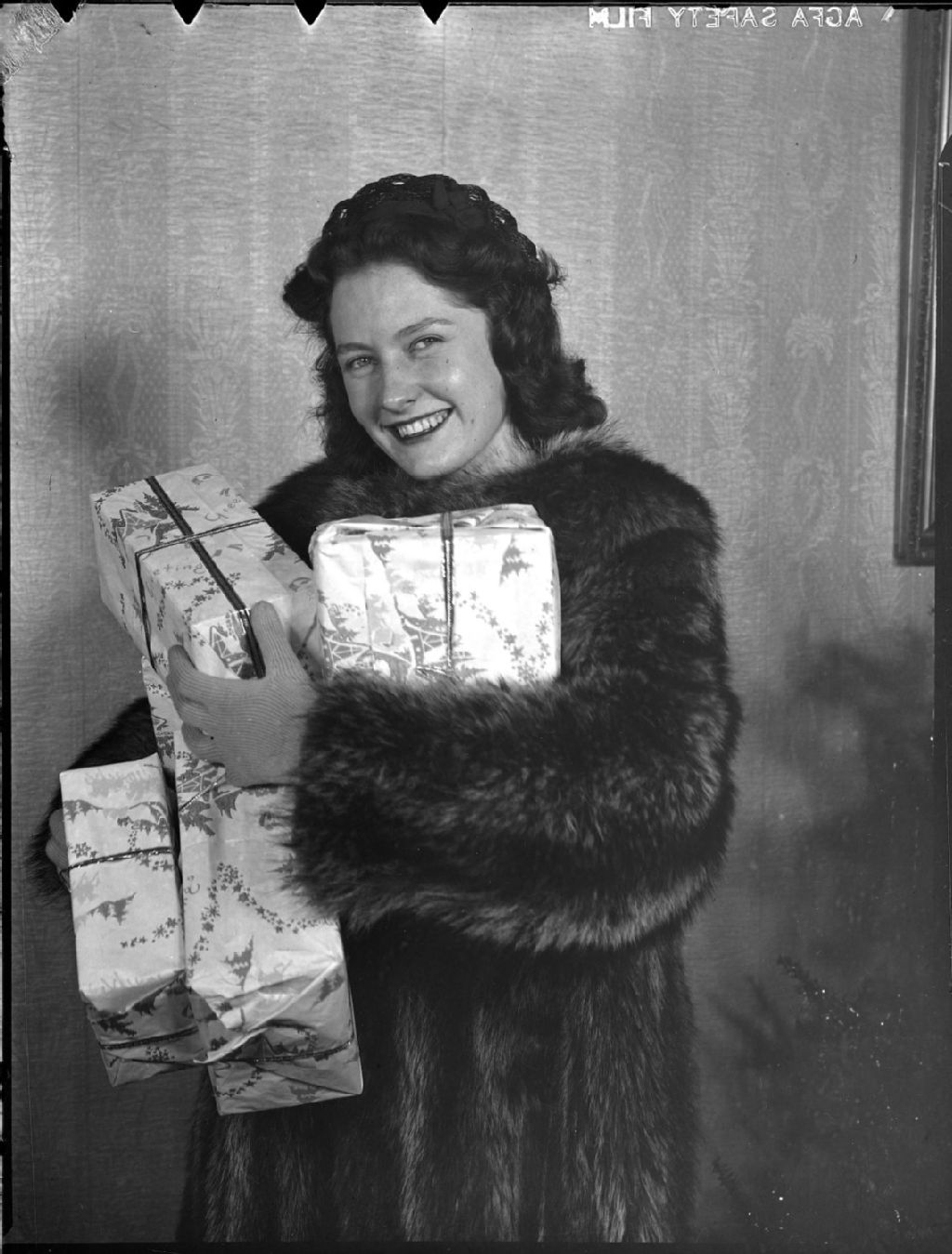 Nous voyons Marjorie Ewen posant en manteau de chat sauvage les bras pleins de cadeaux emballés