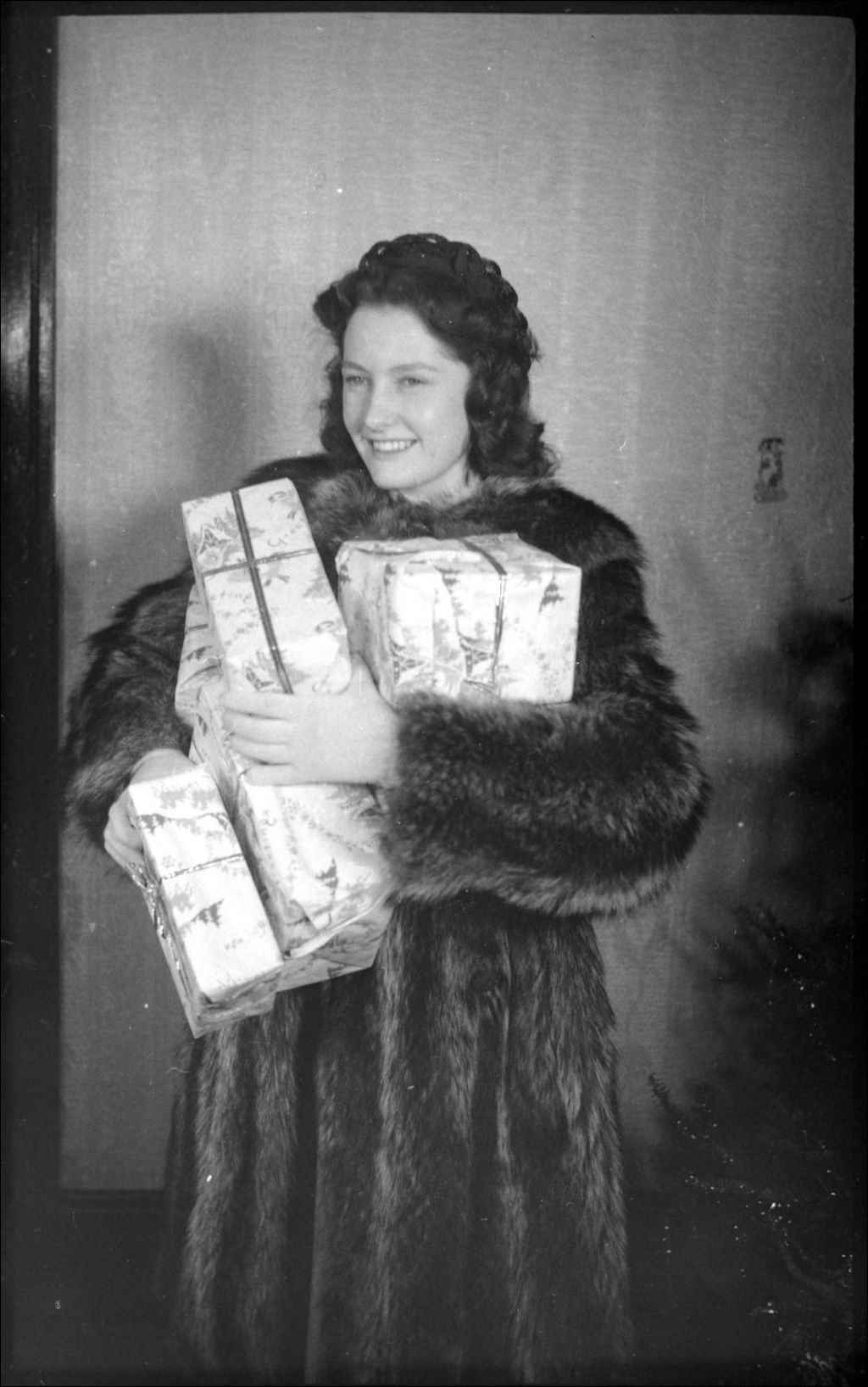 Nous voyons Marjorie Ewen en manteau de chat sauvage les bras pleins de cadeaux emballés