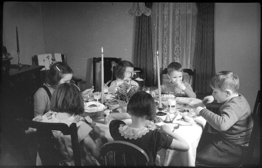 Lors d'un repas du temps des Fêtes, nous voyons un groupe d'enfants attablés et mangeant. Nous apercevons sur la table des chandeliers, un centre de table, des couverts et des mets