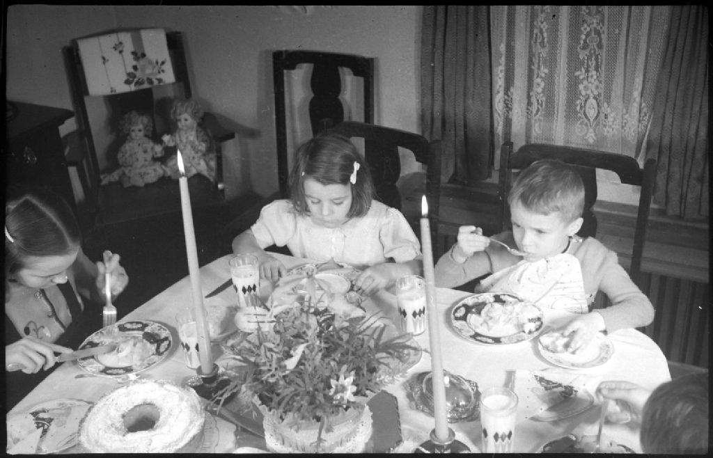 Lors d'un repas du temps des Fêtes, nous voyons un groupe de trois enfants attablés et mangeant dont David et Barbara Luck. Nous apercevons sur la table des chandeliers, un centre de table, des couverts et des mets. Nous remarquons, derrière, des rideaux de dentelles et deux poupées jumelles