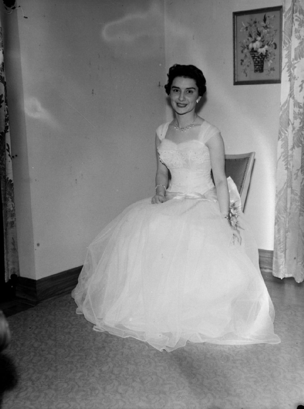 Nous voyons Monique Desmarkais, en robe de bal