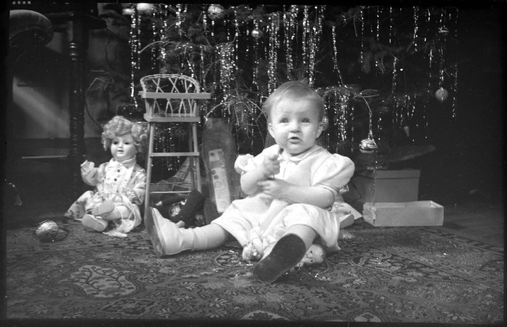 Nous voyons, assis sur un tapis à motifs, un bambin d'environ un an vêtu d'une robe, au pied d'un arbre de Noël avec des boîtes vides autour. Derrière, nous apercevons une chaise haute miniature et une poupée déposée au sol