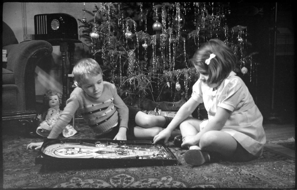 Nous voyons, assis sur un tapis à motifs, deux gamins (David et Barbara Luck) jouant à un jeu de société, le «Trik-E-Shot», au pied d'un arbre de Noël décoré. Derrière, nous apercevons une poupée au sol, le bras d'un fauteuil, et une radio posée sur un guéridon