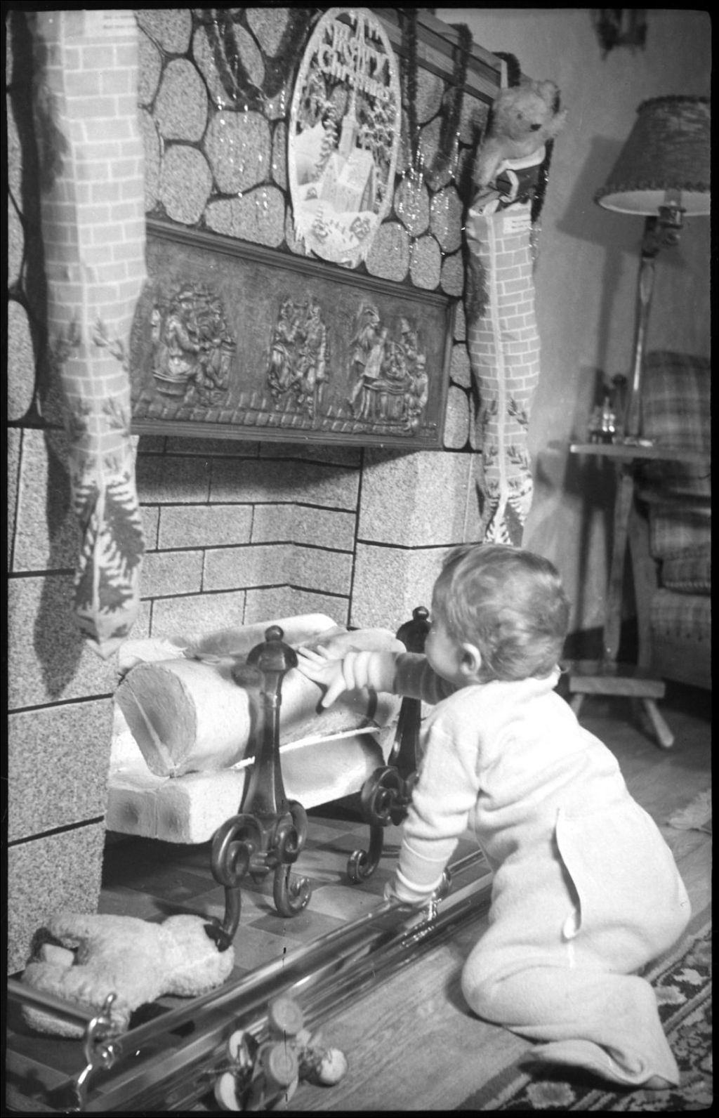 Nous voyons un jeune enfant (Fred Flynn) vêtu d'un pyjama, touchant des bûches posées sur un porte-bûches et des chenets. Nous apercevons des bas de Noël accrochés au manteau de la cheminée, décoré d'une frise de motifs en bas-relief