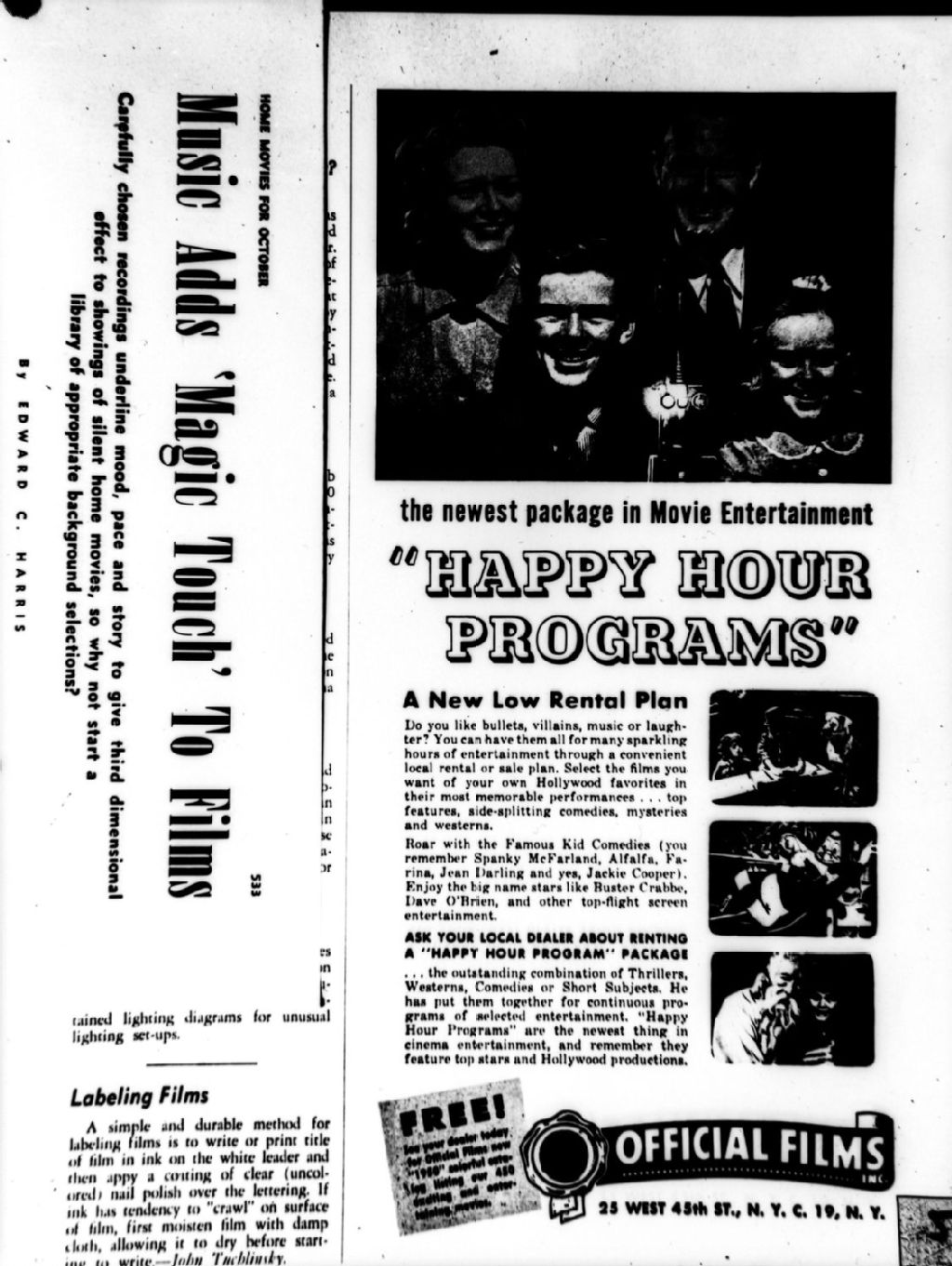 Nous voyons la photographie d'une publicité de la compagnie «Official Films», qui se spécialise dans la location de films. Nous voyons également une partie d'article qui traite d'effets sonores à incorporer aux films. Cette photographie est tirée d'une revue