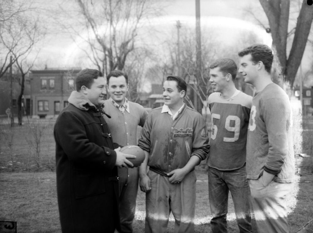 Nous voyons des joueurs de football à l'occasion du «Garbage Bowl» à Montréal-Ouest. Cette partie de football est disputée le premier janvier de chaque année et a pour but d'amasser des fonds pour des oeuvres de charité