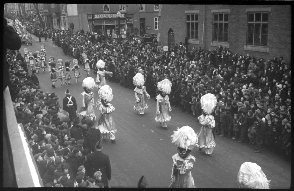 Nous voyons des personnages costumés portant des têtes de papier mâchée durant la parade du Père Noël défilant le long de la rue University, coin Burnside dans l'ouest de Montréal. Nous apercevons deux commerces installés sur la rue Burnside: «Dominion Store Limited» et «Viau Hairdresser»