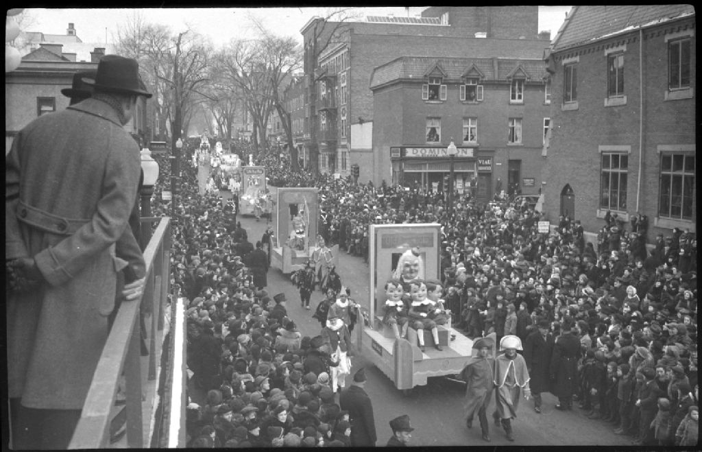 Lors du défilé du Père Noël, nous voyons cinq chars allégoriques et des personnages costumés défilant le long de la rue University à l'angle de la rue Burnside dans l'ouest de Montréal sur laquelle nous remarquons deux commerces: «Dominion Stores Limited» et «Viau Hairdresser». Une foule nombreuse assiste au défilé. Des spectateurs observent la scène à partie d'un balcon