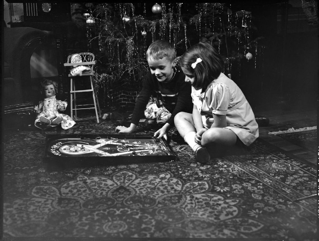 Nous voyons, assis sur un tapis à motifs, deux gamins (David et Barbara Luck) jouant à un jeu de société, le «Trik-E-Shot», au pied d'un arbre de Noël décoré. Derrière, nous apercevons une poupée au sol, le bras d'un fauteuil, et une chaise haute avec une poupée de chiffon