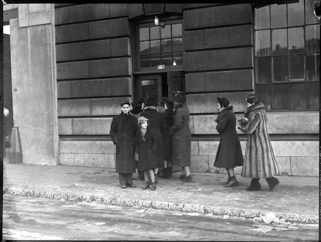 Nous voyons des personnes en manteau d'hiver dans une rue de Montréal, devant une porte sur laquelle nous pouvons lire l'inscription «Employees Only - Women»