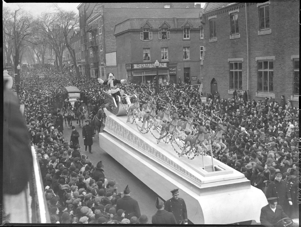 Nous voyons le char allégorique du Père Noël dans son traîneau tiré par des rennes et suivi par une garde de cavaliers en uniforme défilant le long de la rue University à l'angle de la rue Burnside dans l'ouest de Montréal. Nous remarquons deux commerces: «Dominion Stores Limited» et «Viau Hairdresser». Une foule nombreuse assiste au défilé