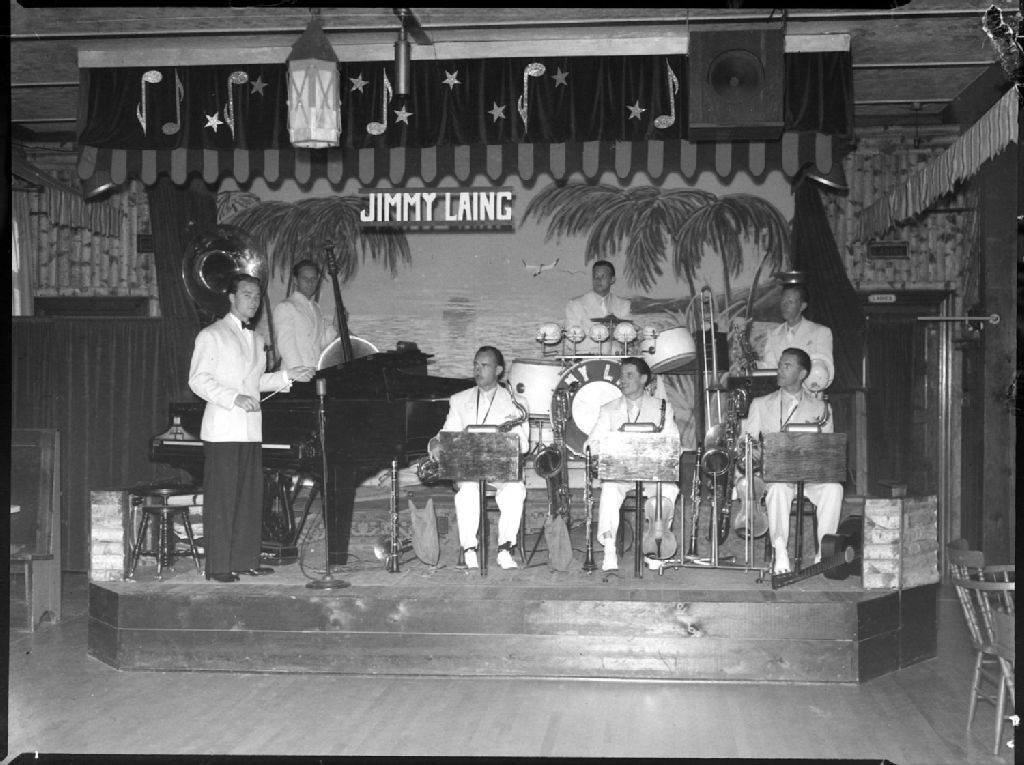 Nous voyons le «Jimmy Laing Orchestra» avec leurs instruments et un piano à queue sur une estrade décorée dans une salle de l'auberge «Maples Inn» dans l'ouest de Montréal