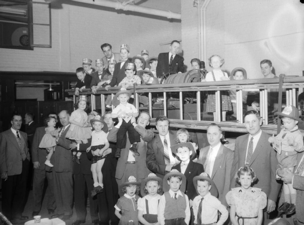 Party Group. Adults and Children : Xmas Party : Mtl. West Fire Station, 17 décembre 1956, Archives nationales à Montréal, Fonds Conrad Poirier, (06M,P48,S1,P22262), Poirier, Conrad.