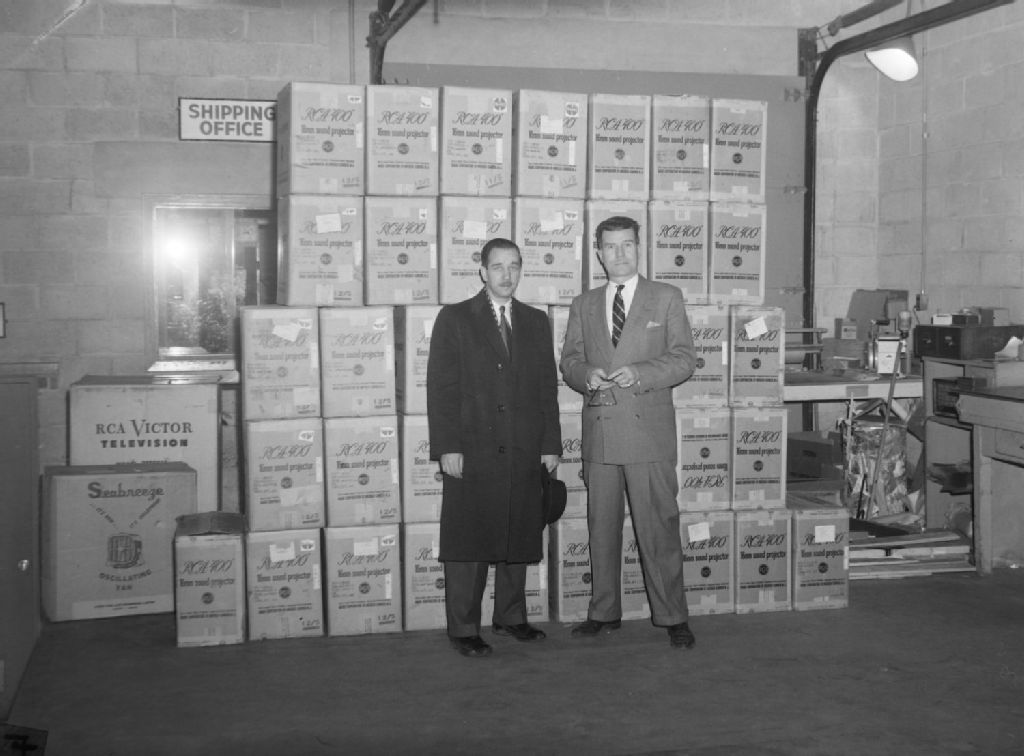 Nous voyons George De Lanauze posant devant un inventaire de projecteurs de films et télévisions de marque «RCA». Nous voyons également un ventilateur de marque «Seabreeze». Cette photographie a été prise dans un entrepôt
