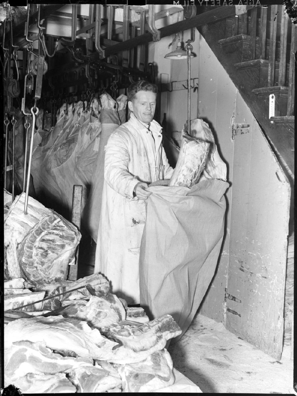 Nous voyons un boucher vêtu d'une blouse blanche dans un entrepôt frigorifique, emballant une carcasse de viande. Nous apercevons d'autres carcasses emballées et suspendues à des crochets et d'autres qui sont empilées