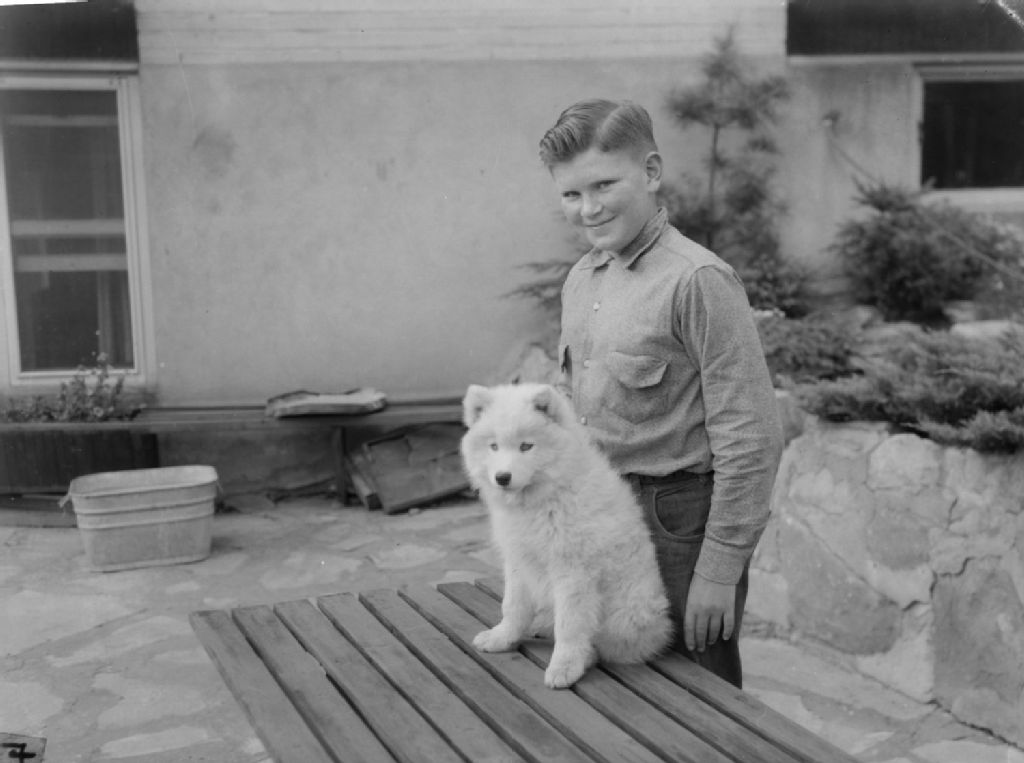 Nous voyons un enfant posant en compagnie de son chien de race Samoyède