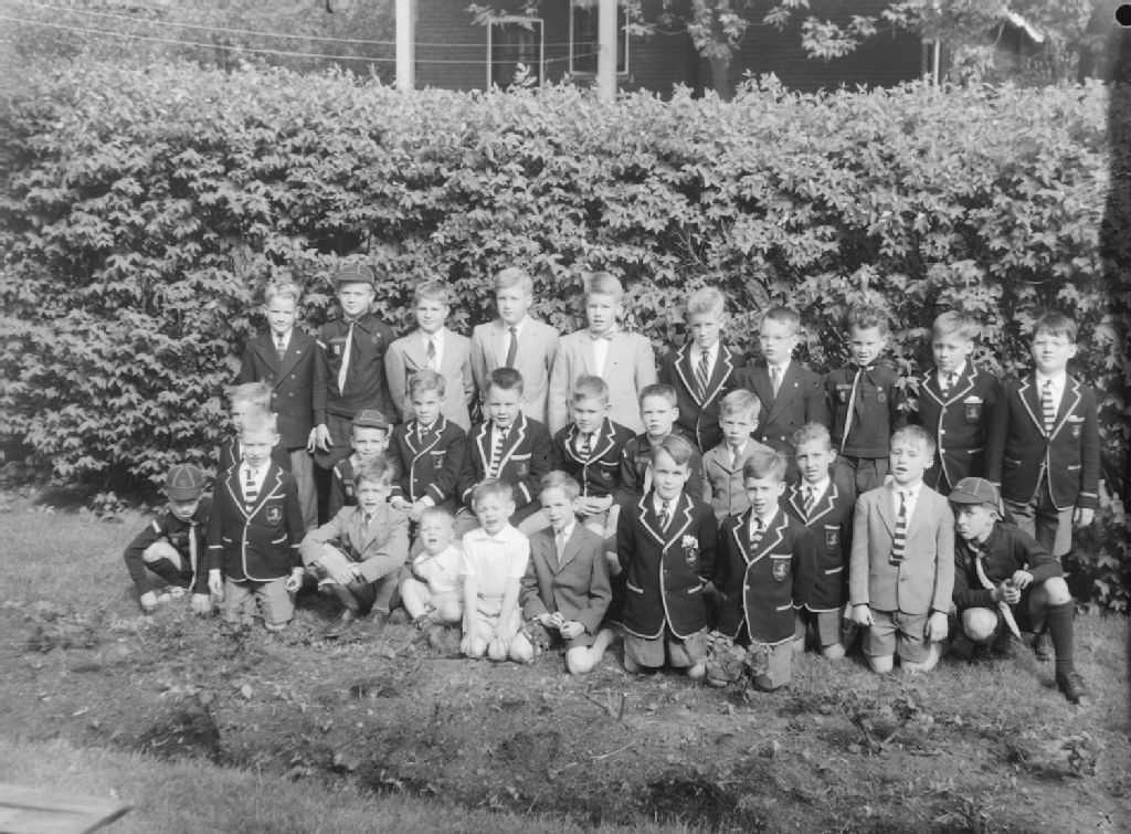 Des garçons sont réunis dans un jardin pour une fête organisée pour David Chenoweth qui habite avenue Kindersley à Montréal. Plusieurs portent le veston de Selwyn House School et quatre sont en uniforme de scout