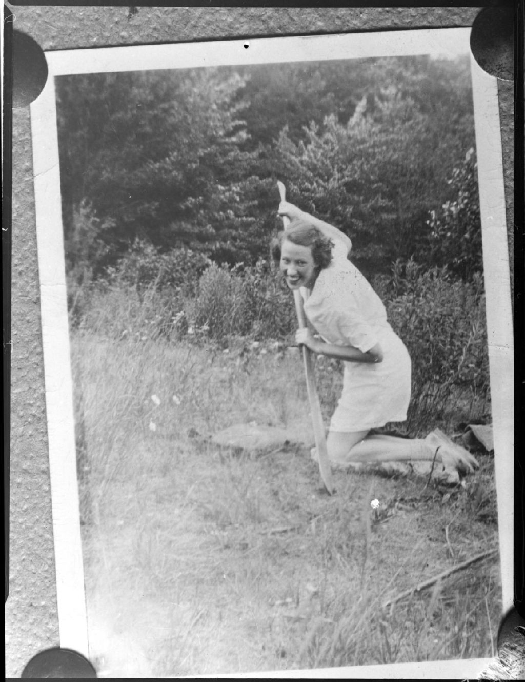Nous voyons la reproduction d'une photographie pour le compte de Eric Morris. La photographie représente une jeune fille en tenue estivale, agenouillée et s'appuyant sur un aviron