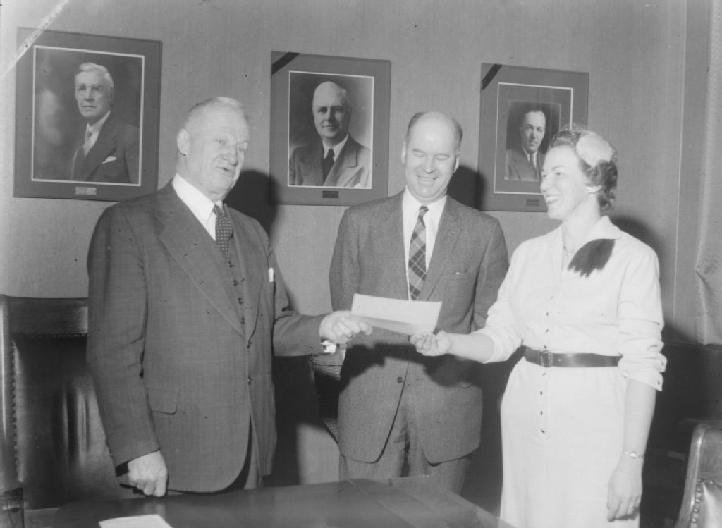 Nous voyons le maire de Montréal-Ouest, Monsieur Higgins remettant un document à une femme. Nous remarquons à l'arrière-plan, des portraits d'anciens maires de cette ville