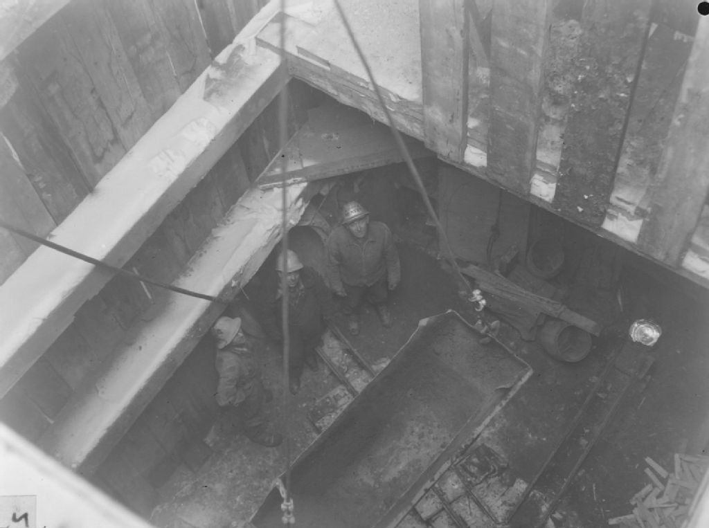 Nous voyons des ouvriers lors de la construction d'un système d'égoût à Montréal-Ouest. Nous remarquons qu'ils portent des casques. Sur l'un d'eux nous voyons l'inscription «Beaver»