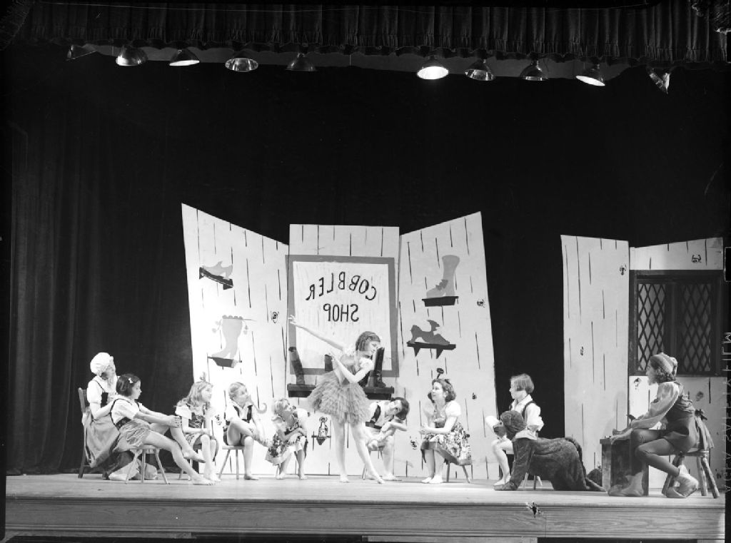 Nous voyons de jeunes danseurs, de la troupe «Mary Cuzanne Dance», costumés en gamins du XIXième siècle sur une scène à Montréal. Ils posent devant un paravent portant l'inscription «Cobbler Shop»