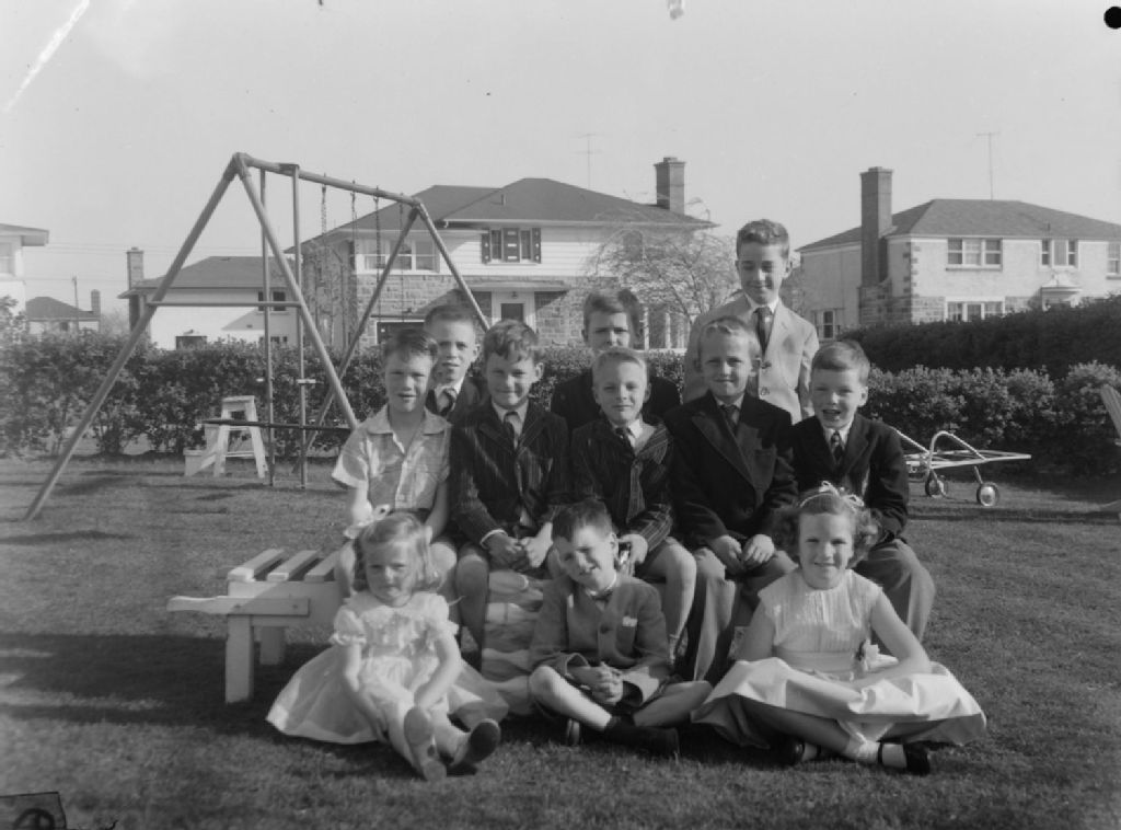 Nous voyons un groupe d'enfants réunis lors d'une fête, dans la cour arrière de la résidence de la famille Deakin au 2110, chemin Hanover à Mont-Royal. Nous remarquons à l'arrière-plan des balançoires ainsi qu'une chaise longue