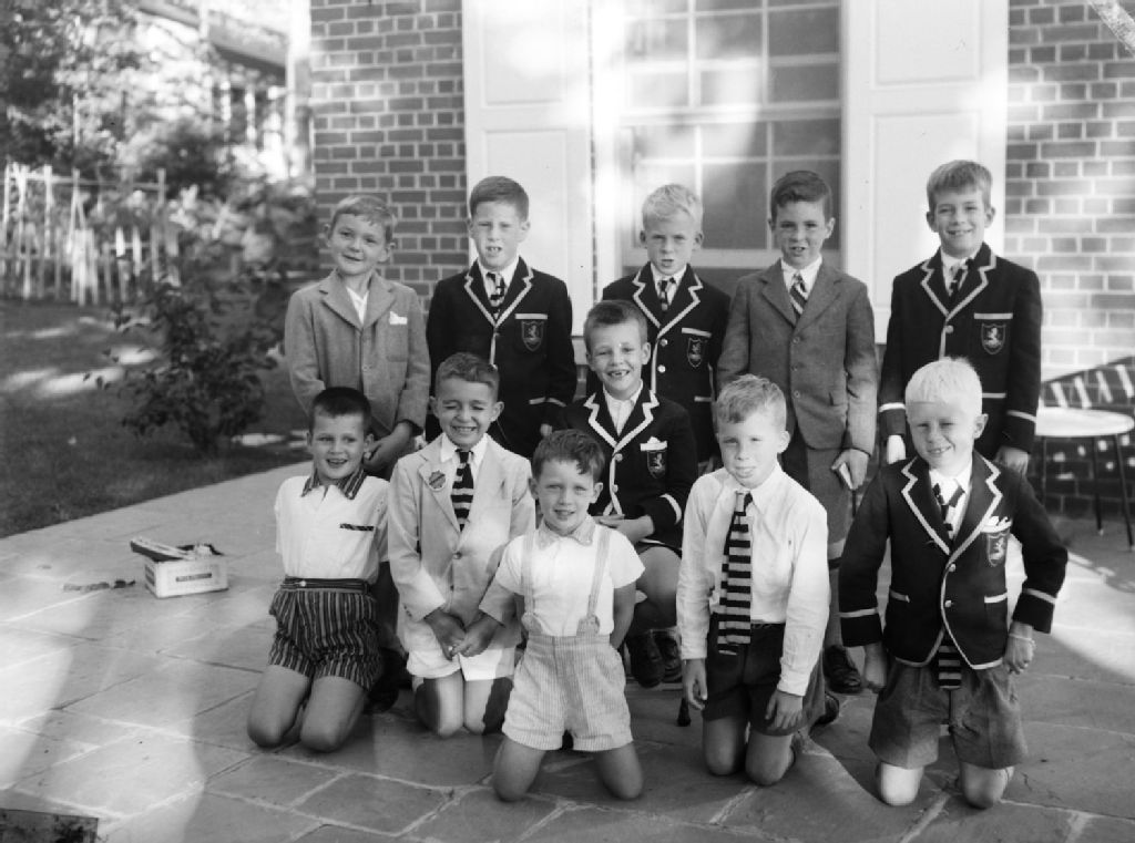 Nous voyons un groupe de garçons réunis lors d'une fête donnée pour Michael Fitzpatrick à la résidence familiale au 9, avenue Roxborough à Westmount. Ils sont sur le patio et certains portent un veston de «Selwyn House School»