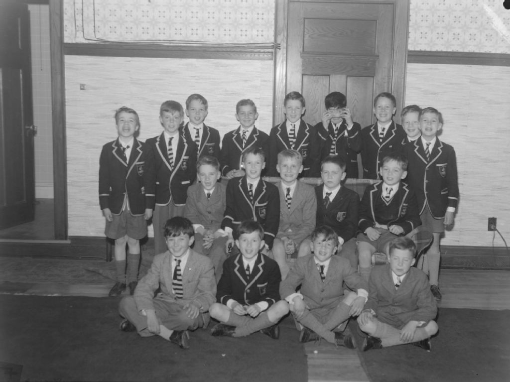 Nous voyons un groupe de garçons réunis lors d'une fête donnée pour Timothy Kingston à la résidence familiale au 25, avenue Forden à Westmount. Plusieurs portent des vestons de «Selwyn House School»